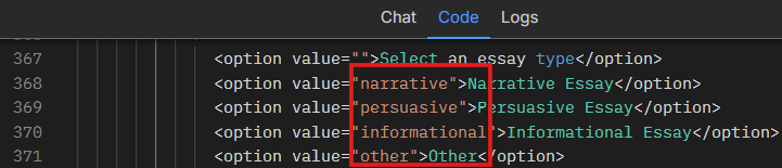 The reason why the {{essayType}} output isn’t capitalized is because of the Custom Interface code. Right now, it saves the values in lowercase, as you can see in lines 367–371: